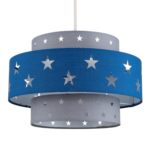 Modern cylinder light shade in a blue & light grey finish, featuring a cut out star design which illuminates when the light is switched on. Easily fits to your standard ceiling light socket - no wiring necessary! A fantastic addition to a young child's bedroom or baby's nursery.