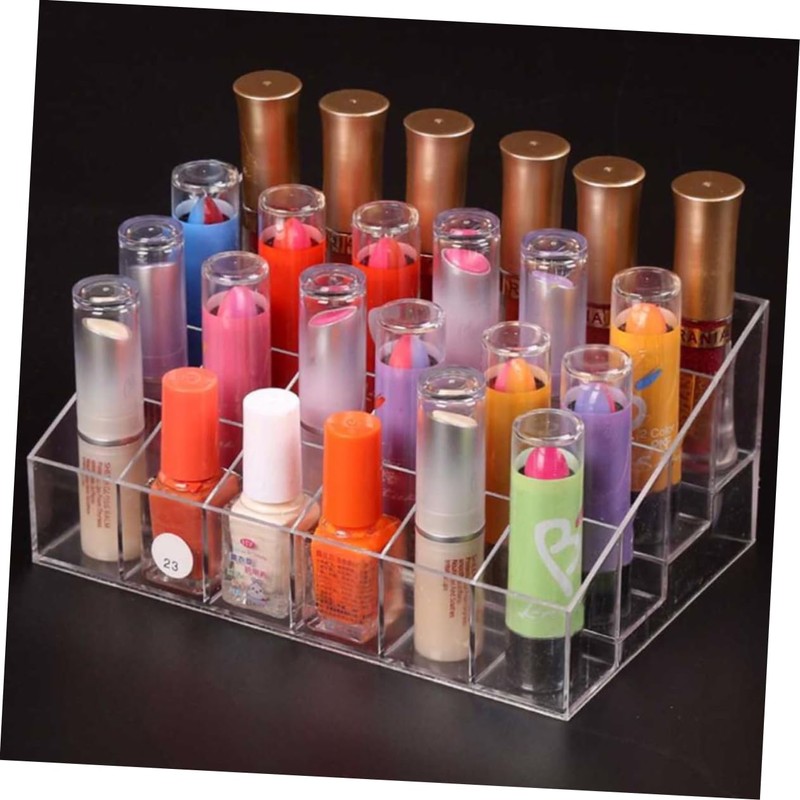 - Acrylic lip gloss organizer-- girds make it easy to hold various cosmetics and jewelry like lipstick, mascara, makeup brush, nail polish, necklace, finger ring and more. keep all your cosmetics and jewelries in one location to save space.