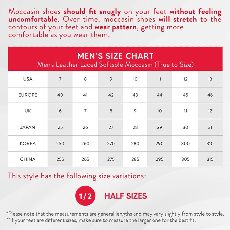 • CONVENIENT SIZING: Each Minnetonka moccasin softsole runs true to size; Refer to the convenient Size Chart icon to ensure correct sizing before purchasing; If your feet are different sizes, make sure to measure the larger one for the best fit