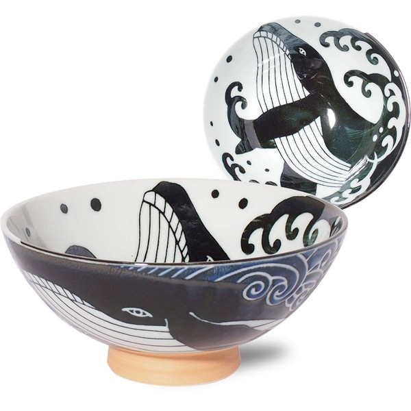 Minorutouki Rice Bowl Extra Large White Wave Whale Blue φ5.8×H2.6in 7.76oz Made in Japan