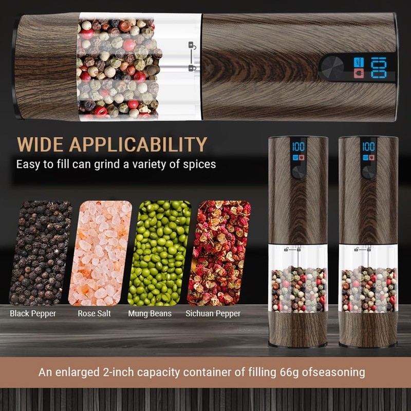 - LCD Display: Our automatic salt and pepper grinder set features a clear LCD display. It shows the battery level and warns you when the battery is low. So you always know when to charge the grinder.