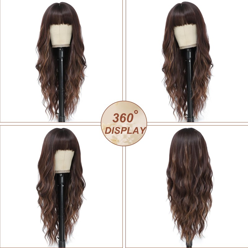 - 【Long Brown Hair Wig】This brown mix blonde wavy wig is long wig with bangs that frame your face perfectly, the full bangs add a perfectly feminine touch,while the wavy hair lend a beachy look that certainly won't miss the target