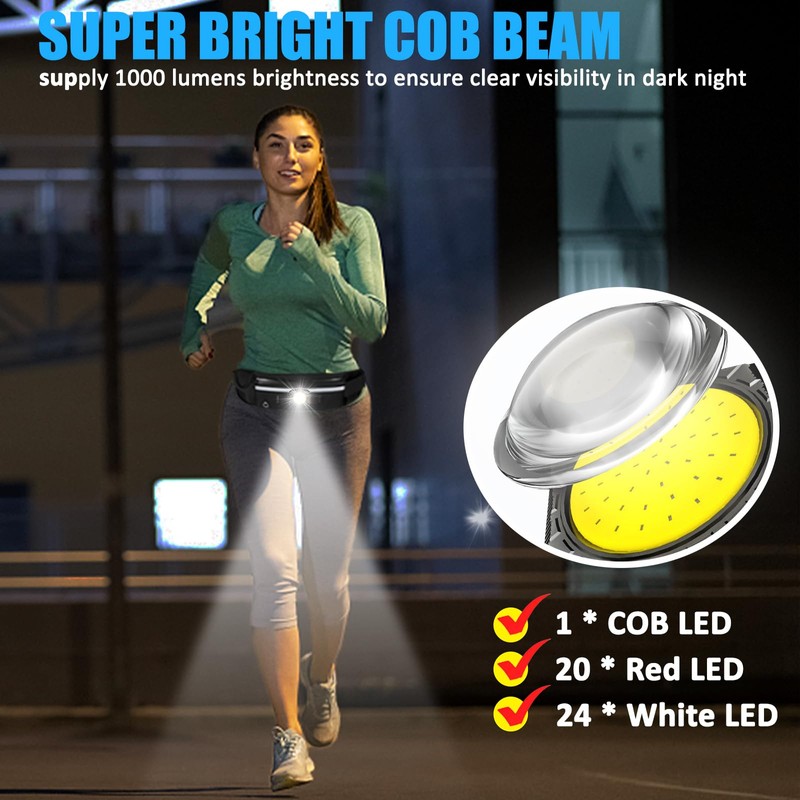 - COB LED Technology: The waist belt running Llght features COB LED technology that produces 1000 lumens brightness, providing bright and stable illumination for your outdoor adventures. Whether you're camping, hiking, running, or cycling, our headlamp ensures that you can see clearly even in the darkest environments.