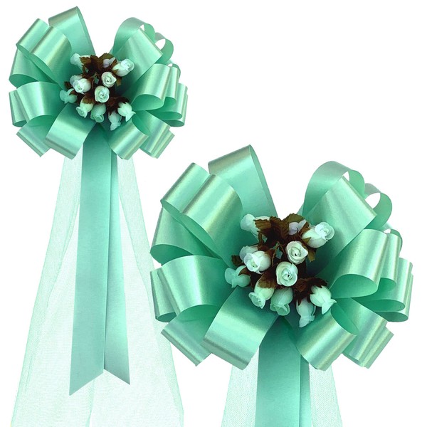 Mint Green Pull Bows with Tulle Tails and Rosebuds - 8" Wide, Set of 6, Spring, Wedding Pew Bows, Aisle Decoration, Reception, Anniversary, Birthday, Christmas, St. Patrick's Day, Easter