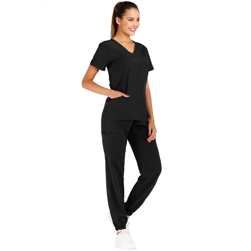 - TRIM: The uniform top shirt features short sleeve, V neck, two front patch pockets, the bottom features mid rise, full elastic waistband, tapered slim fit, 2 slash pockets and two cargo pants; elastic jogger hem. The fabric is 4-way stretch moisture wicking athletic fabric fit you much well and comfort.