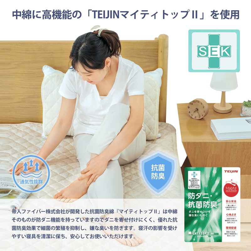 - (Natural Materials, TEIJIN Filling) Made of safe and healthy natural fibers, rayon and hemp fibers, this is a natural environmental protection material in the natural world, and is also environmentally friendly, and also good for your health. The filling is made with the high-performance TEIJIN Mighty Top II. The Mighty Top II is an antibacterial and deodorizing cotton developed by Teijin Fiber Co., Ltd., the filling itself has a dust mite-resistant feature, so it is resistant to dust mites and has excellent antibacterial and deodorizing properties that inhibit the growth of bacteria and prevents unpleasant odors. Keep your bedding clean and safe to use when it is sensitive to night sweats