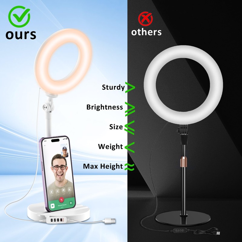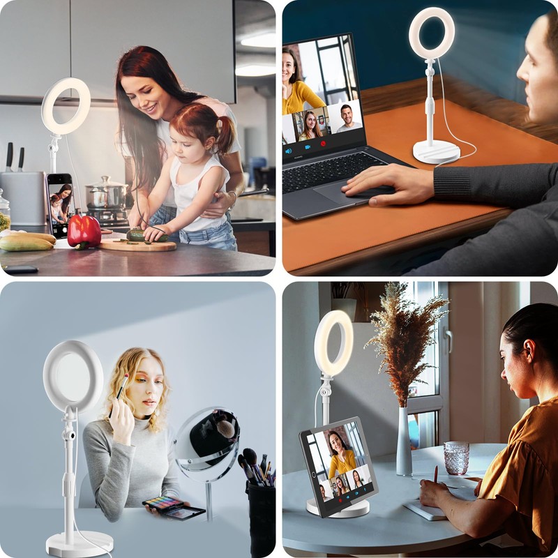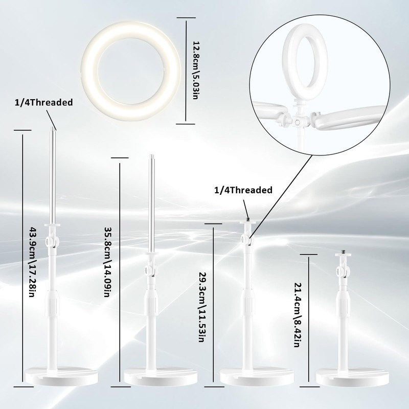 - 【 Extendable Stand 】 The ring light table stand is telescopic, height can be adjustable from 8.5inch/21.5cm to 17.3inch/44cm. This makes it easy to place the ring light behind your computer, laptop or monitor.