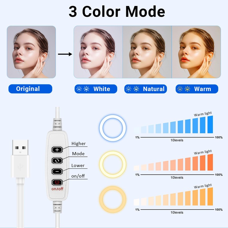 - 【 Dimmable Light 】The 5 inch ring light is dimmable which has 3 color modes, each modes has 10 brightness levels, it is soft and bright enough to need your lighting need. It is powered by 5V USB, then computer/laptop/wall charger/power bank can be the power source for this circle light