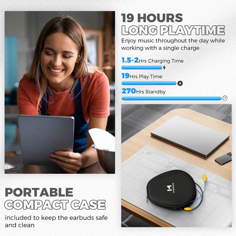 • IPX5 Sweat Resistant: With IPX5 waterproofing, these Bluetooth neckband earphones resist rain and sweat during intense work. Ideal for activities like landscaping, construction, and gym workouts. Includes a compact case for easy portability