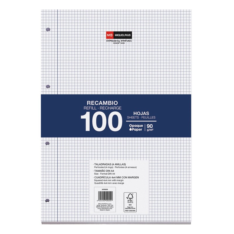 Miquelrius - Refill Pack 100 Sheets, 4mm Grid & Margin, A4 Size, 4 Hole Punched, 90gsm Paper