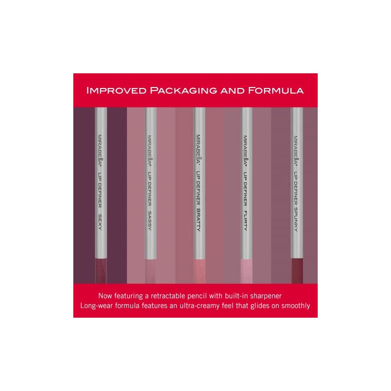 • Mirabella Line and Define Retractable Lip Definer: Creamy liner formula glides onto lips for flawless all-day wear while the retractable pencil allows for effortless application. The built-in sharpener on the base allows for ease of use on the go! Color: Bratty