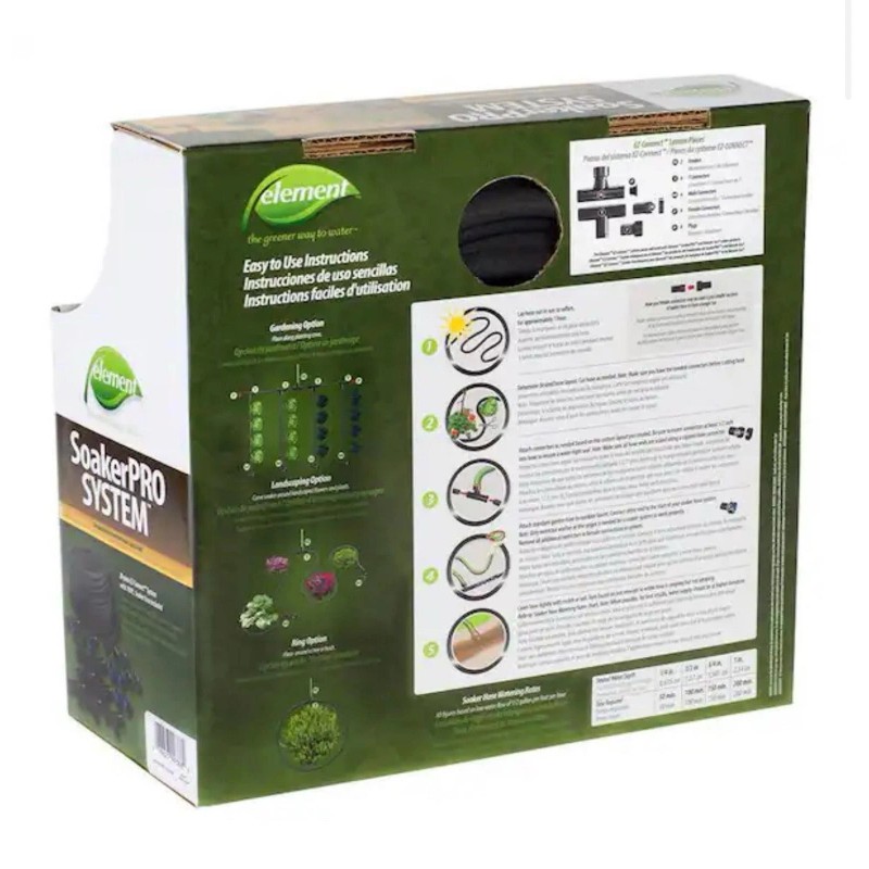 For an efficient, economical, eco-friendly and fully customizable way to water your plants, look no further than the Element SoakerPRO soaker hose system by Swan.The SoakerPRO soaker hose system includes a 100-foot soaker hose. Featuring tiny holes or "pores" along its length, the soaker hose weeps water directly to plants' root systems at a rate of 0.5 gallon-1 gallon per foot per hour on ground level. This not only reduces evaporation, but also uses up to 70 percent less water than a conventional sprinkler.The soaker hose is very lightweight, which makes it easy to wind around plants and set under soil or mulch. Once established, you no longer have to carry or drag a cumbersome garden hose to water your garden. In addition, your delicate flowers, foliage and vegetables are protected from the intense water pressure that comes from a traditional water hose and/or nozzle.