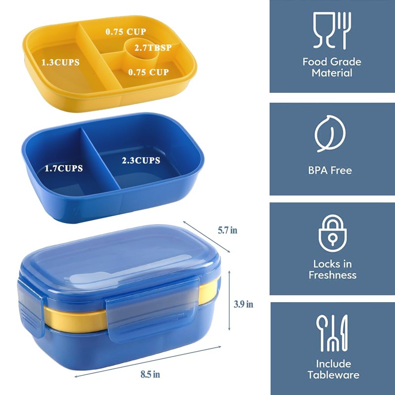 - 3 Layers Stackable Large Bento Box -- Our bento boxes has a large capacity of 1900ml (8.5*5.7*3.9 inches), with a stackable design, 3 layers for food sorting, 64 OZ reasonable capacity.The top container is for tableware and snacks,middle container features 4-compartment include dip that hold 3.0 cups of food while the bottom container with 2-compartment holds 4.0 cups - together they’re perfect for packing a variety of foods in healthy portions. no matter main dish, side dish, dessert or snack.