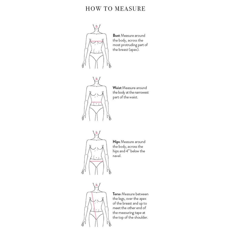 - SIZING: Order a swimsuit in your usual size for the most comfortable and slimming fit. Sizing up is suggested depending on your fit preference or if you prefer a less snug fit. For bust, measure across the fullest part of the breast. For waist, measure the narrowest part of your waist, above your belly button. For hip, measure across the hips about 4 inches below your belly button. For torso, measure between your legs and over the top of the shoulder. REFER TO SIZE CHART ON LEFT.