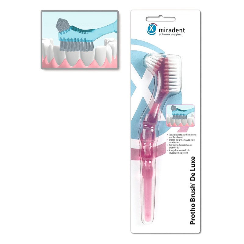 miradent Protho Brush® De Luxe Pink Denture Brush Pack of 1 | Two Sizes on Bristle Areas | Large Ergonomic Handle | Available in Two Colours | Ideal for on the Go