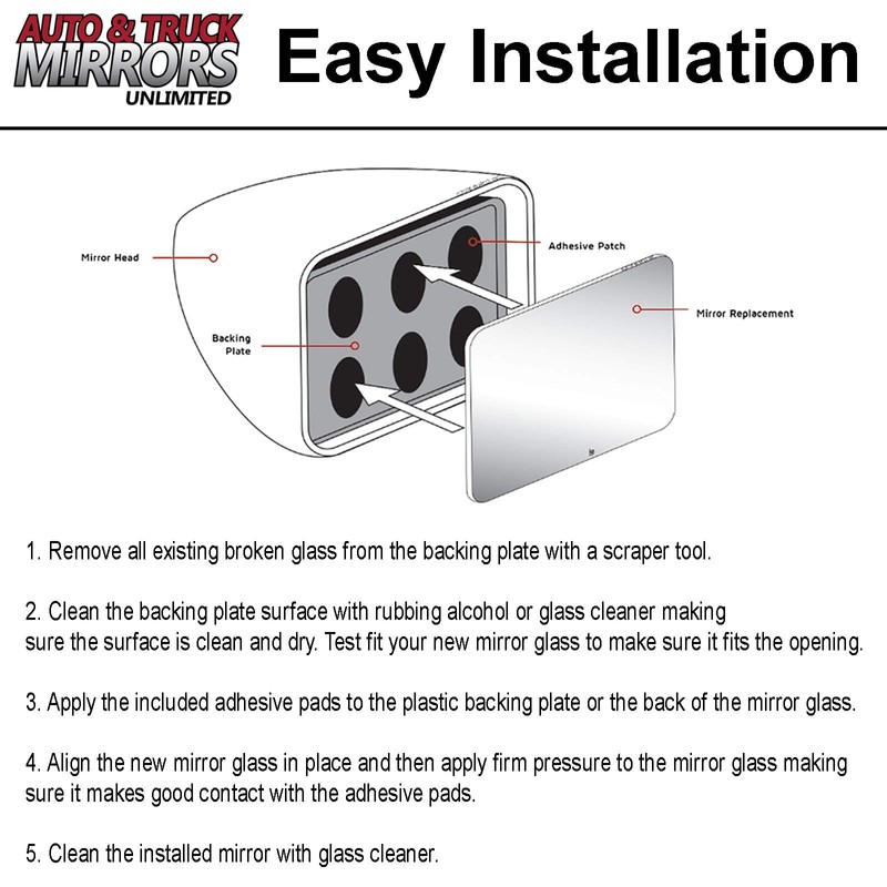 - INCLUDED - A new in box Passenger Side mirror glass replacement (glass lens only) with adhesive pads. The adhesive pads ensure easy installation, maximum adhesion and optimum heat transfer (if heated). Each mirror glass and adhesive pads, comes with easy to follow step by step installation instructions.