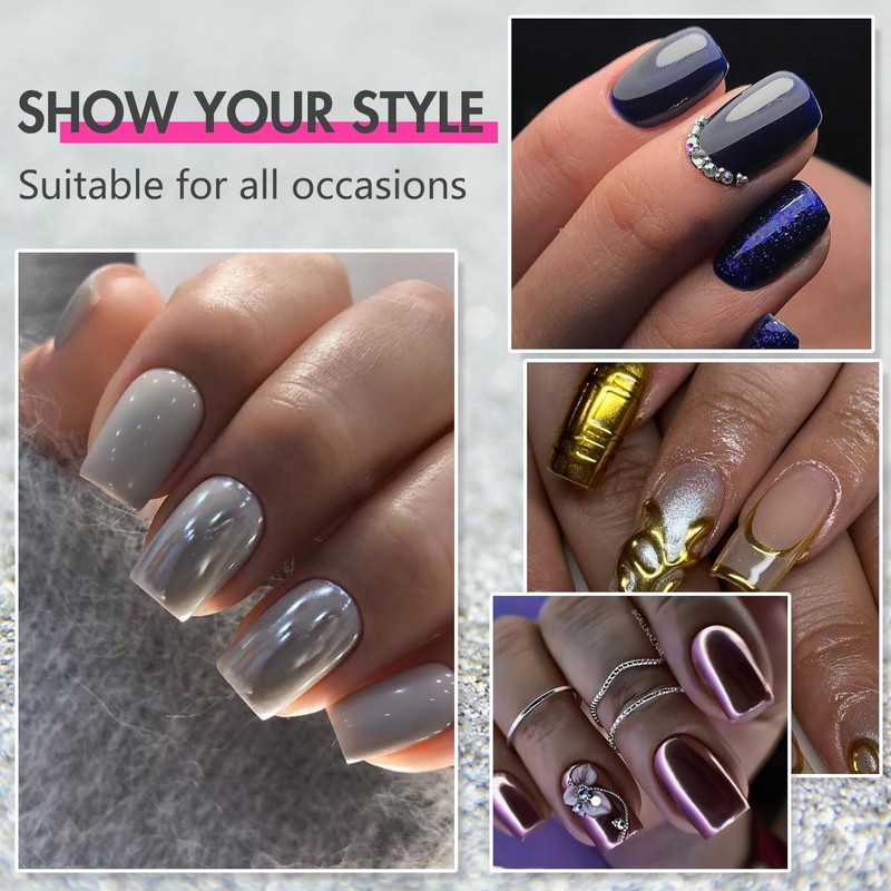 - DIY Nails That Wow: with these medium short fake nails kit, you can save time and easily change styles at any time! So convenient that save a trip to the salon with designs. This set of chrome-glazed glue-on nails offers a stunning metallic finish in a chic silver hue, adding instant glamour and sophistication to my manicure, these metallic mirror press on square nails punk style look and feel as though I got them professionally done.