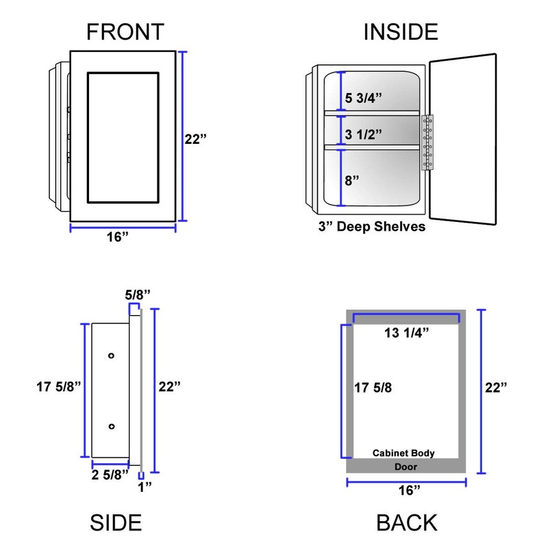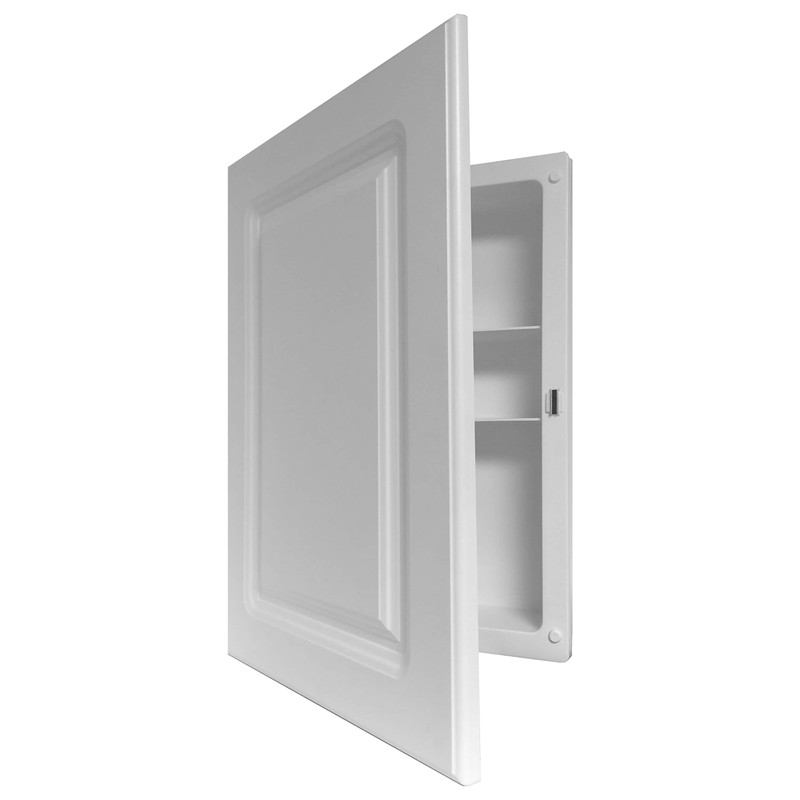 * Molded high impact polystyrene body * Overall Measurements: **16-inches Width x 22-inches Height x 4-inches Depth** * Wall opening W x H x D: **13-3/4-Inches x 18-Inches x 3-1/2-inches** * Full corrosion resistant piano hinge * Two staggered shelves for excellent storage capacity * Round easy-clean corners * Magnetic door catch * Small radius corners for maximum storage * Smooth round bumpers * Reversible cabinet for right hand or left hand opening * Fixed shelves * Finish: White Matte * Easy to install