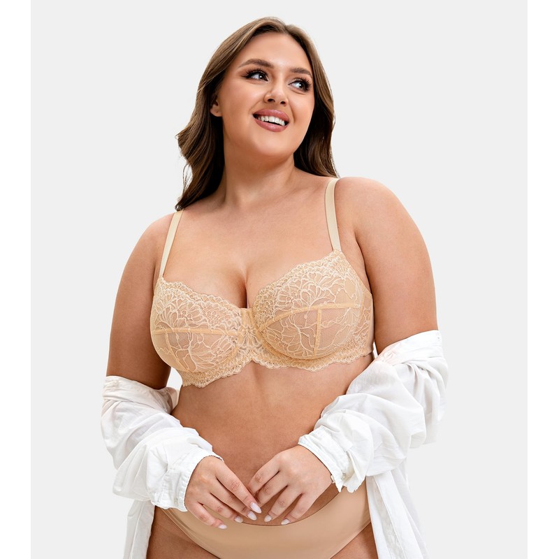 Mirry Lace Bras for Women Plus Size Full Coverage Underwire Floral Lace Non-Padded Bras Unlined 44D Nude