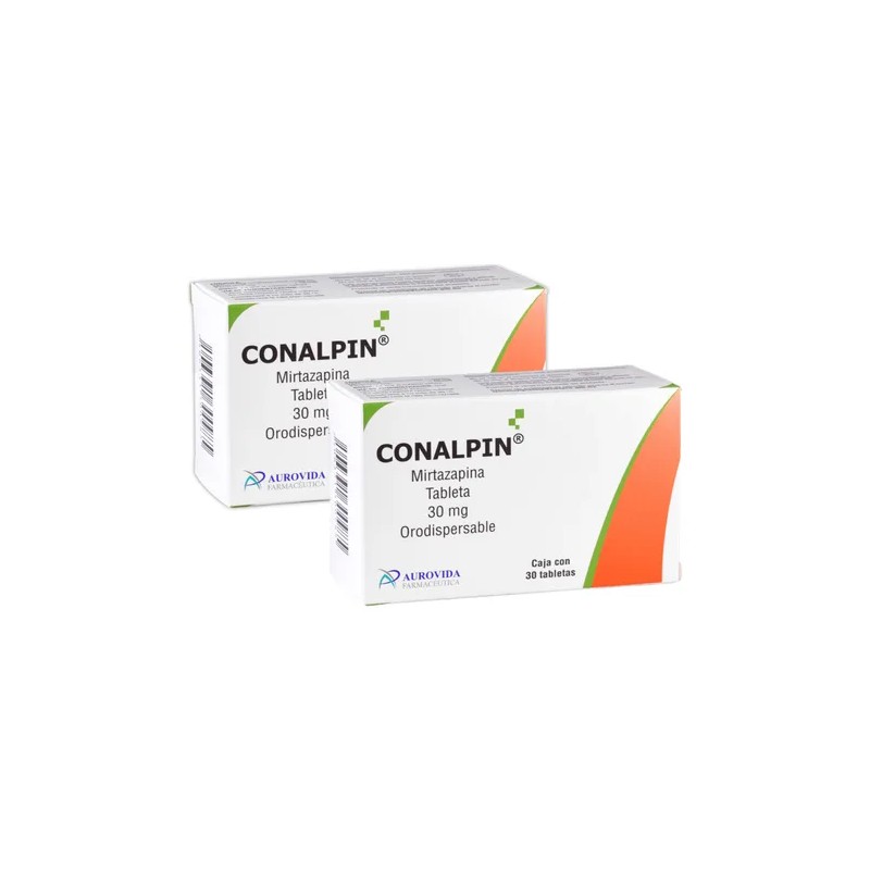 Conalpin (Mirtazapina) 30 mg, tabletas orodispersables, presentadas en un conveniente 2 pack, con 30 tabletas en cada caja, fabricado por Aurovida Laboratorios. Este medicamento cuenta con el registro sanitario COFEPRIS: 109M2016 SSA IV, garantizando su seguridad y eficacia. Este paquete es un total de 60 tabletas.