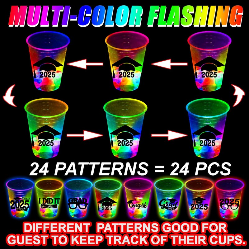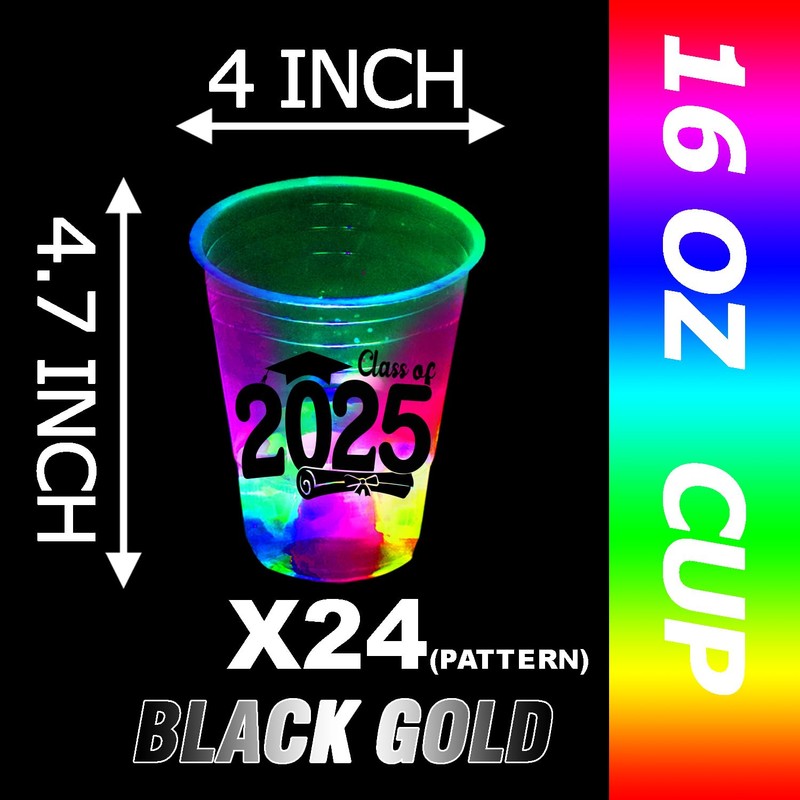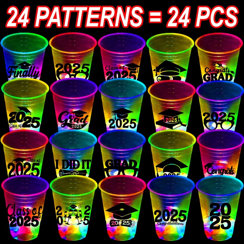 - 2025 Glow Graduation Cups: There are 24 16 oz black 24 different pattern Graduation Cups, 24 LED lights, 24 waterproof stickers.