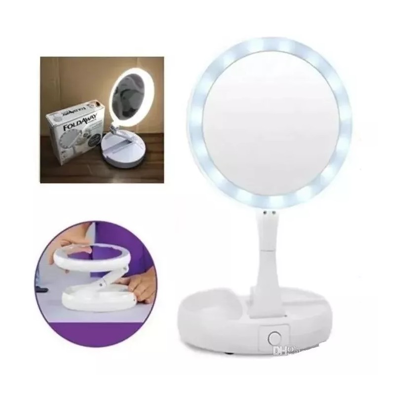 Espejo redondo con luz led plegable y con compartimientos para maquillaje o joyería etc.