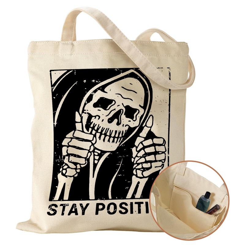 Miss Adola Aesthetic Canvas Tote Bag with Inner Pocket for Women Unique Funny Pattern Design Casual Sturdy Cloth Cotton Totes Bag with Pattern for Vacation, Shopping, Work, Gym - Positive Skull