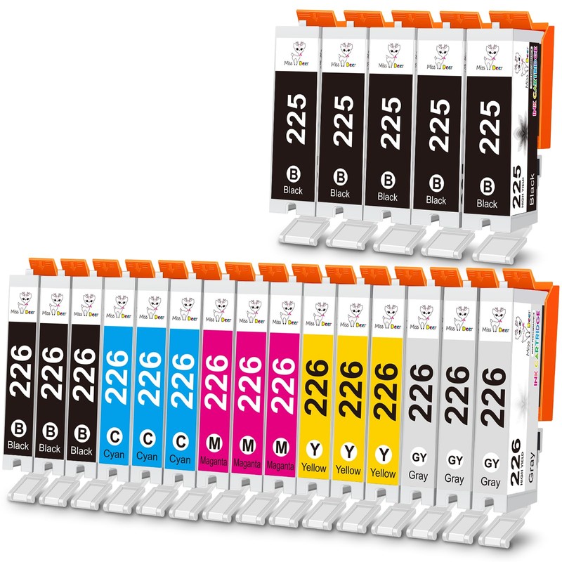 - 📦【Sealed Package】Prevent Ink Leakage. Package includes 1 x User Guide, 1 x Disposable glove, 5 x Large Black PGI-225, 3 x Small Black CLI-226, 3 x Cyan CLI-226, 3 x Magenta CLI-226, 3 x Yellow CLI-226, 3 x Gray CLI-226 ink cartridges (Total 20 Pack, including Gray ink).
