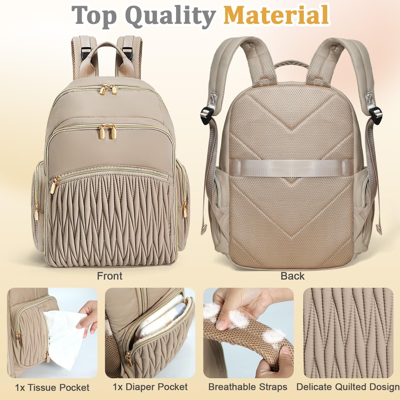 - 【Premium Nylon Material & Practical】:Stylish diaper bag backpack is made of 100% lightweight nylon fabric,delicate quilting design featuring a luxurious & refined texture, lined with 100% light yellow waterproof nylon, soft & comfortable, durable.It comes with convenient stroller buckles,easy to attach most of stroller. An easy-grip top handle. The back pocket has a luggage sleeve,makes it easy to put the cute baby bag in the luggage handle,freeing up you hands.