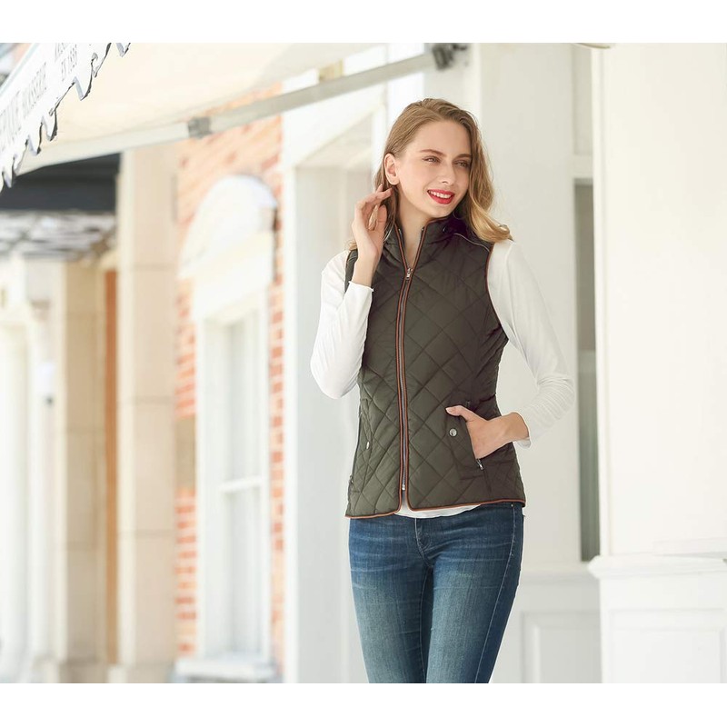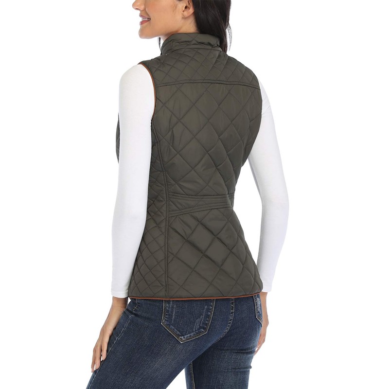 MISS MOLY Women Lightweight Quilted Padded Puffer Vest Stand Collar Zip Up Winter Outwear Gilet (Army green-Color trim, Large)