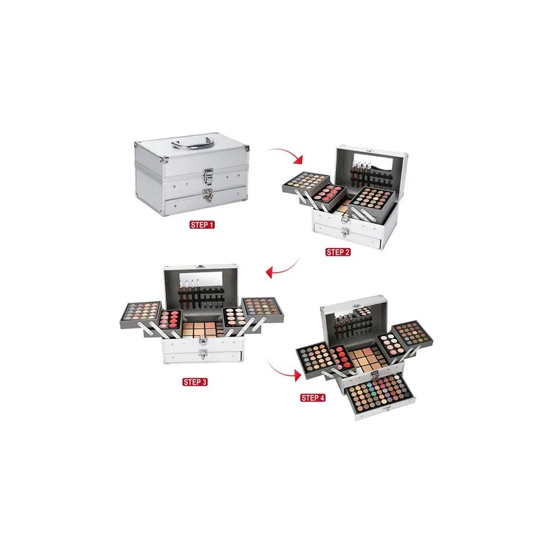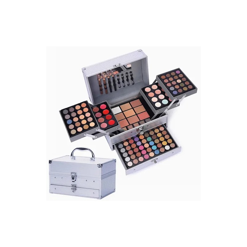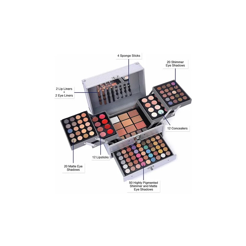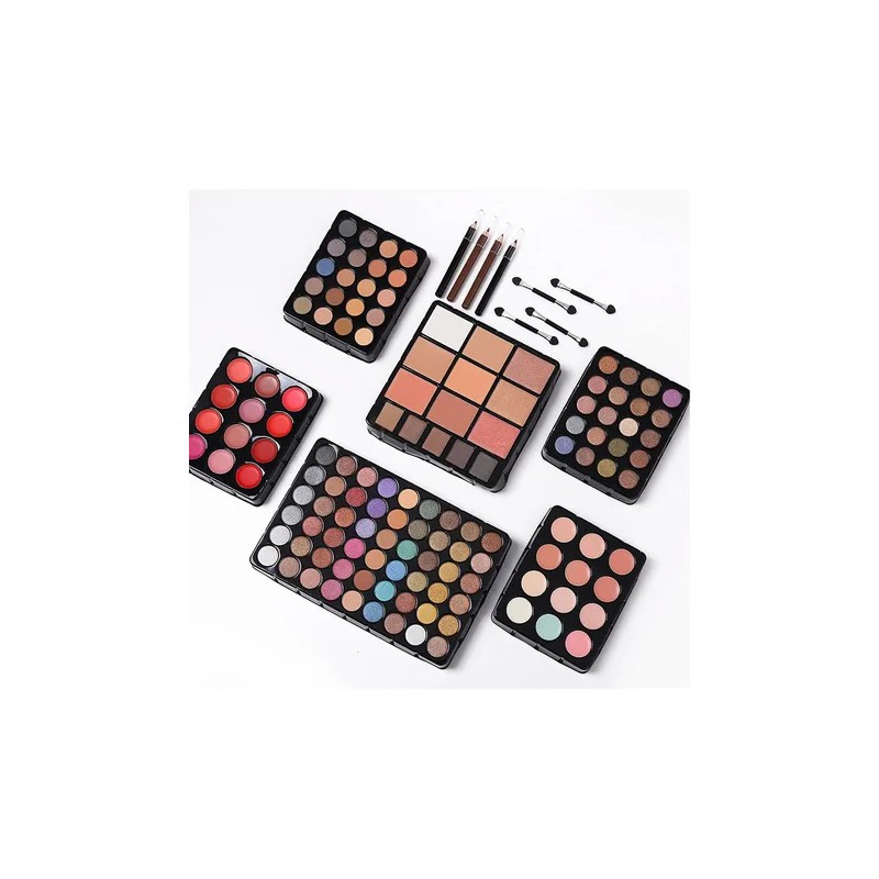 Incluye 94 sombras de ojos de color, 12 lápices labiales, 12 correctores, 5 cejas en polvo, 3 harina, 3 rubor, 3 sombras de contorno, 2 líneas de labios, 2 delineadores, 4 cepillos de sombra de ojos y 1 espejo.