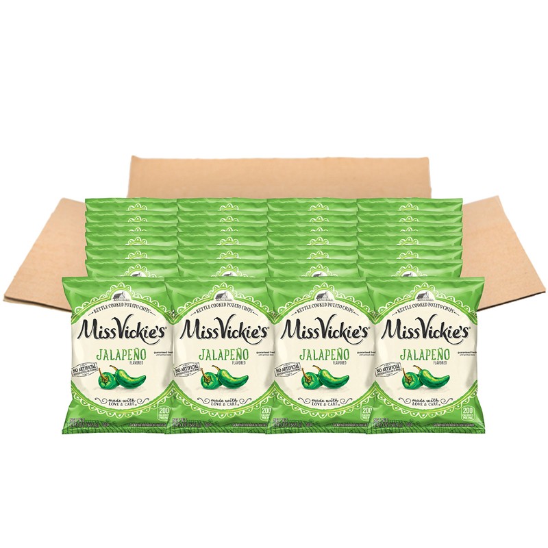 - Pack of 28, 1.375 ounce bags of MISS VICKIE'S Jalapeno Flavored Kettle Cooked Potato Chips