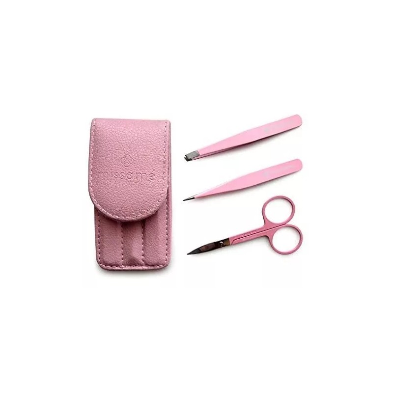 Juego de pinzas para cejas de precisión de acero inoxidable con punta puntiaguda e inclinada, tijeras para cejas curvas, viene con funda de viaje rosa.