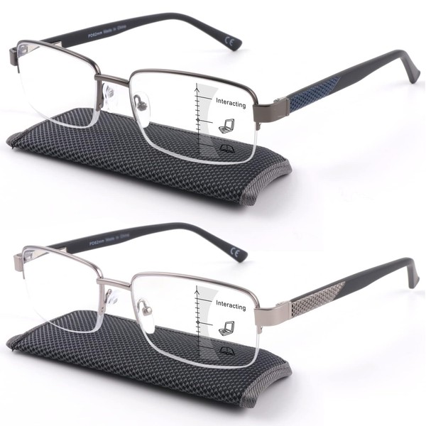 Missfive 2-Pack Men Premium Multifocus Reading Glasses Blue Light Blocking, Progressive Metal Frame with No Broken Spring Hinge(for Mid-Near Workspace, 2.5x)
