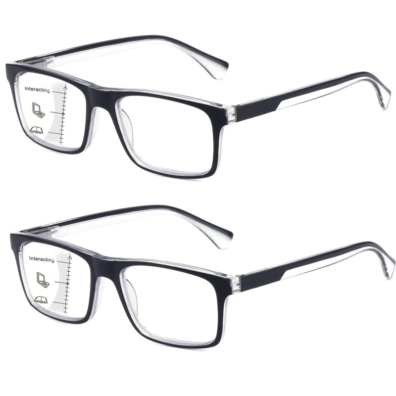 Missfive 2-Pack Mens Light Multifocus Progressive Reading Glasses Blue Light Blocking, Multifocal Spring Hinge No-Line Trifocal Readers Black Eyeglasses(Workspace For Near Range, +1.75)