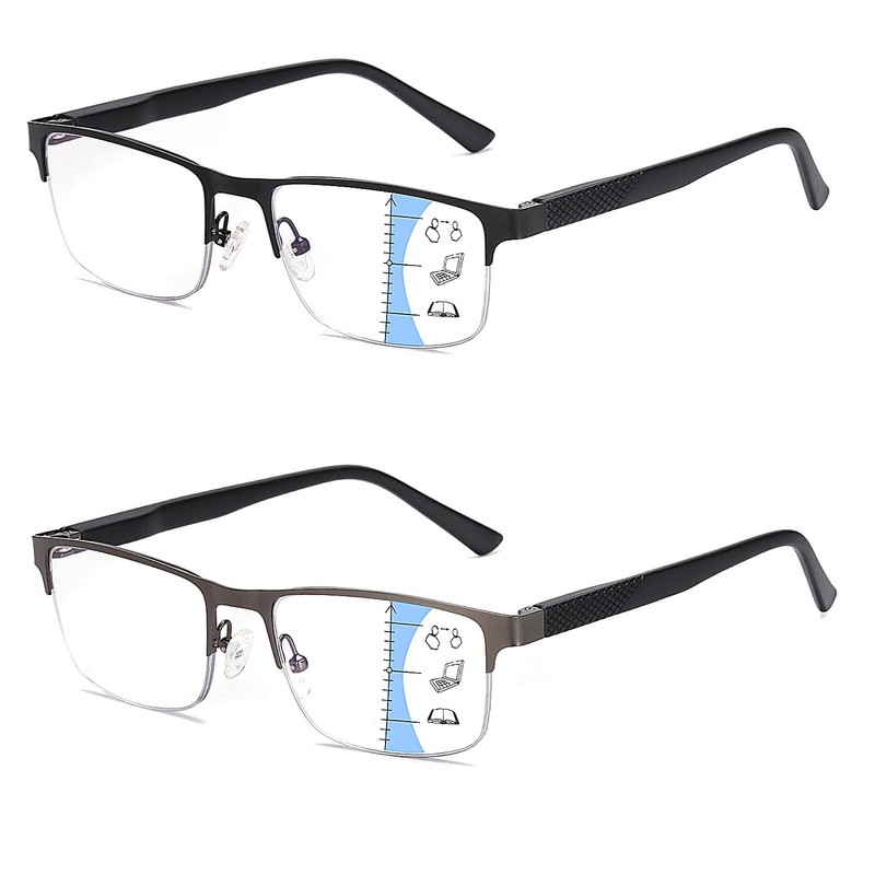 Missfive 2 Pack Mens Quality Multifocus Progressive Reading Glasses Blue Light Blocking, Multifocal Spring Hinge No-Line Readers Half Frame Metal Eyeglasses(Workspace For Near Range, 1.00x)