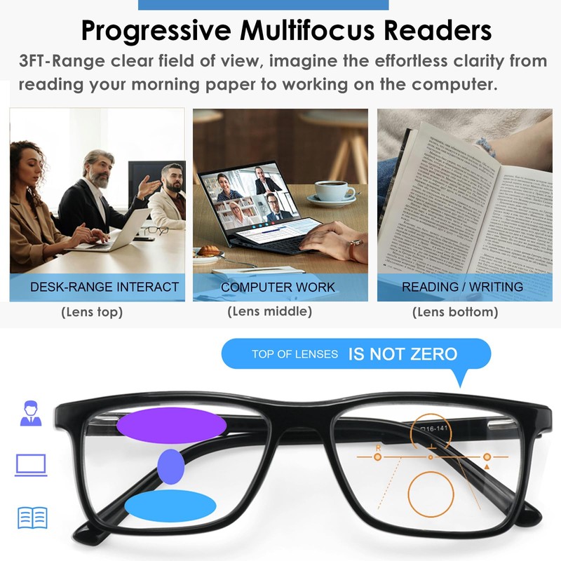 - Workspace multifocal glasses: Effortless clarity from reading the morning paper to working on your computer with our multi-focus readers; The top part of the lens is half the magnification you select, just right for your 3 feet desk-range communication / interaction; The middle part is slightly reduced transition strength for PC / Laptop screen time; The bottom is the normal power you choose for reading fine texts / writing notes