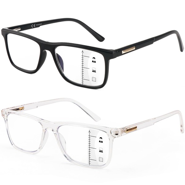 Missfive 2 Pack Unisex Multifocus Progressive Reading Glasses - Blue Light Blocking Anti UV/Eye Strain, Durable Metal Spring Hinge Multifocal Readers, Stylish Cheaters for Near Workspace,+300