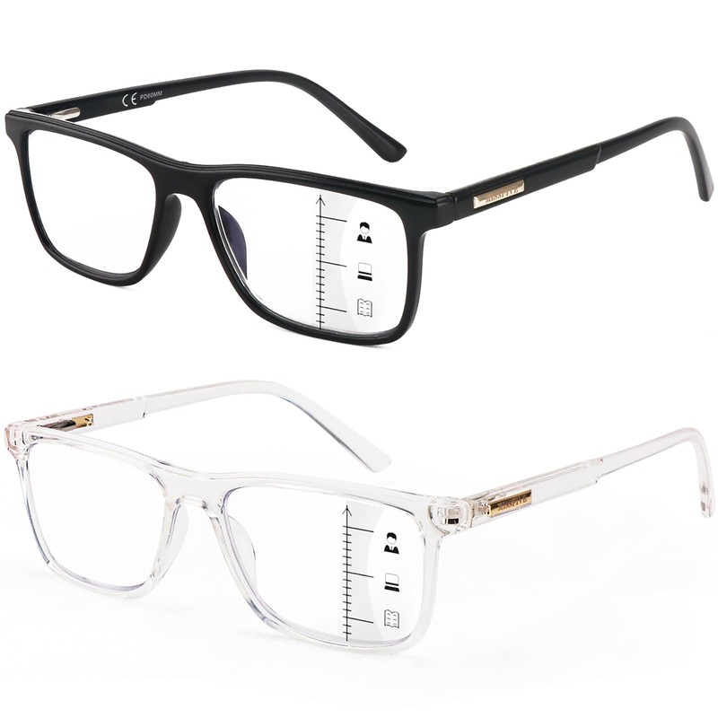 - Convenience set: 2 Classic colors progressive multifocus reading glasses, 2 leather pouches, 1 microfiber glasses cleaning cloth, 1 glasses rope hanging; Our blue light progressive reading glasses make a wonderful and practical present for friends and family, enhancing their daily comfort and eye healthy