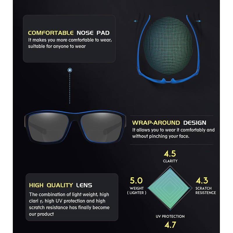 - BIFOCAL READING SUNGLASSES The Missfive sports sunglasses are equipped with bifocal lenses that are suitable for both long and near vision. So you can read or check your phone, book or watch especially in bright sunlight without compromising visibility or comfort
