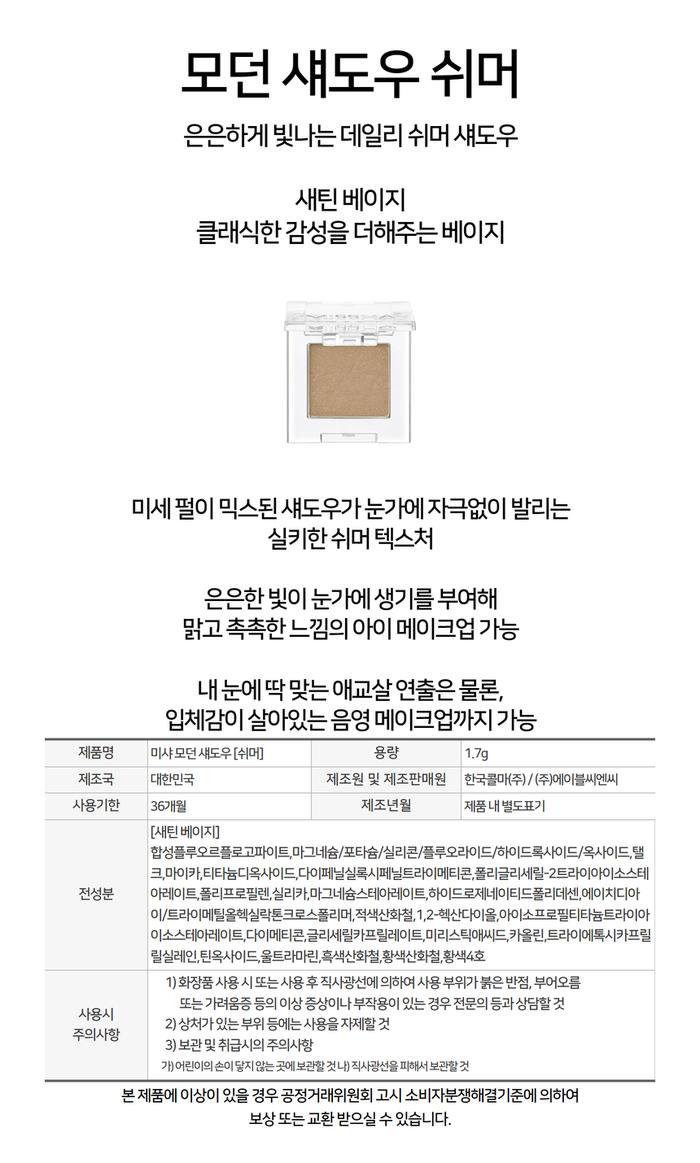 Missha Missha Modern Shadow Shimmer 1.7g (Satin Beige) / 미샤 미샤 모던 섀도우 쉬머 1.7g (새틴 베이지)