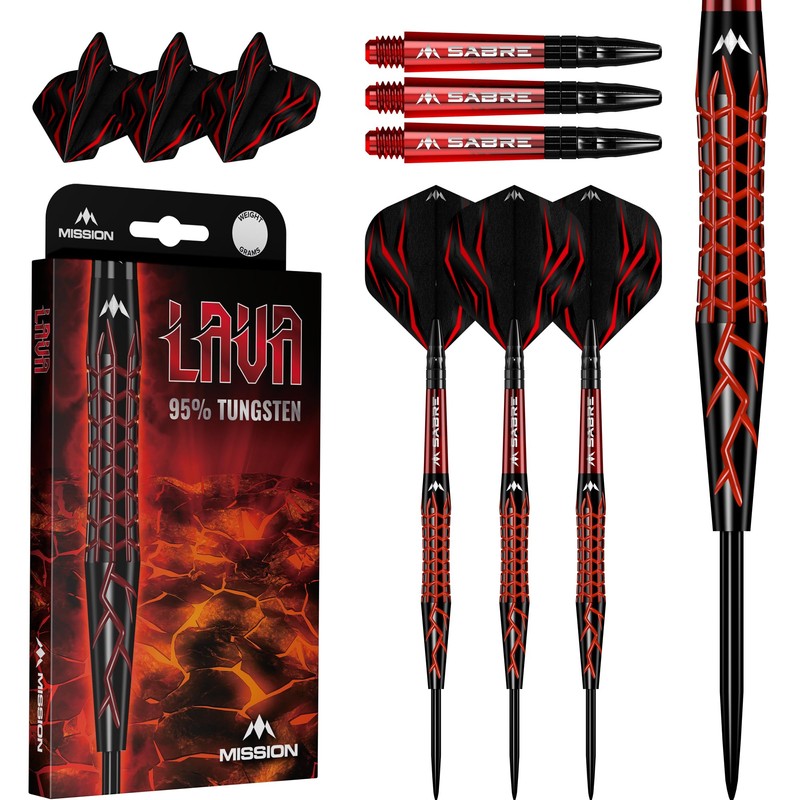 - The Lava dart is complete with a set of short red and black Mission Sabre shafts which keeps the flight in place. The textured Mission Lava flight features a volcanic design in black and red. Available in a choice of weights.