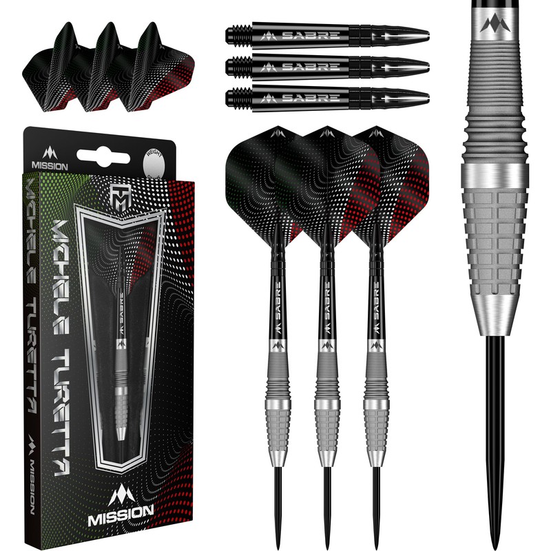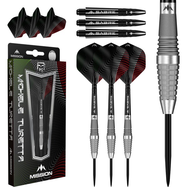 - The front of the dart tapers to a black point, whilst the rear of the dart leads to a black Mission sabre shaft with a black top and Turetta’s own signature Mission flights.