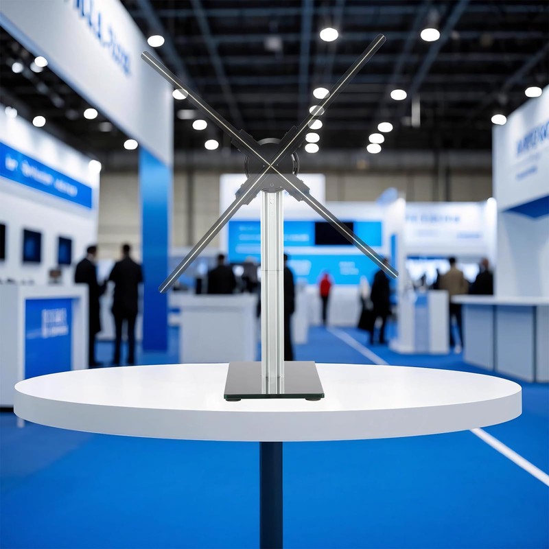 - Space-saving desktop design allows the hologram fan stand to fit perfectly on desks counters and retail display tables without occupying much space