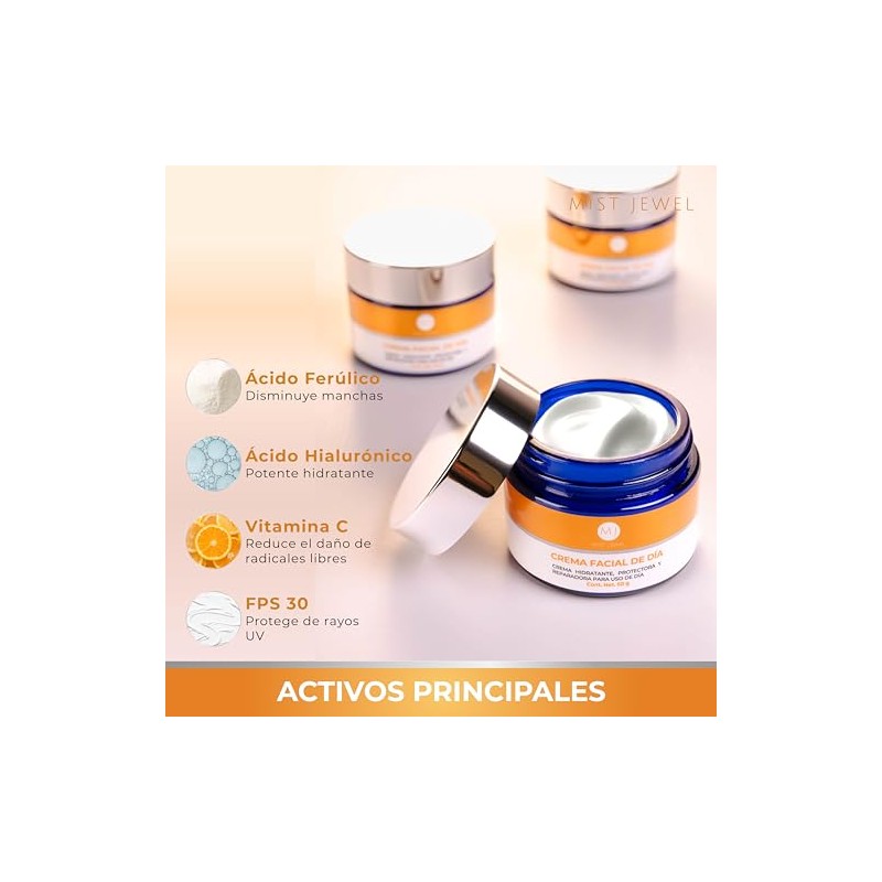🌟 💄 MIST JEWEL Crema de Día Facial con FPS 30, Ácido Hialuronico, Ferúlico y Vitamina C | Crema hidratante y protectora de cuidado facial para uso diurno skin care hombre y mujer. Todo tipo de piel 50g 💄 🌟