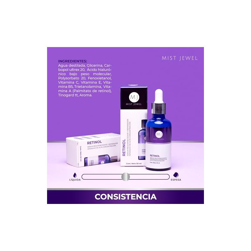 MIST JEWEL Serum Facial Retinol (Vit A), Ácido hialurónico, Vitamina C, Vit E, B5, hidratante y reparador | Suero para hombres y mujeres Anti manchas Nocturno, cuidado facial iluminador e hidratante de alta efectividad 50ml