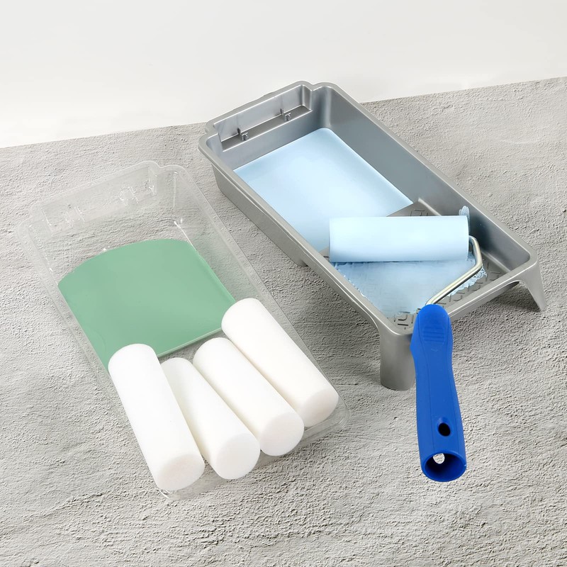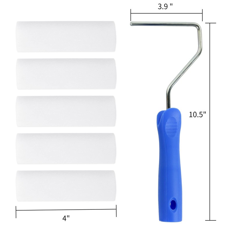 - Paint roller kit: small paint roller kit contains 4 inch high-density foam paint roller cover x 5, 4 inch paint tray x 1, 4 inch paint tray liner x 1, 4 inch paint roller frame x 1