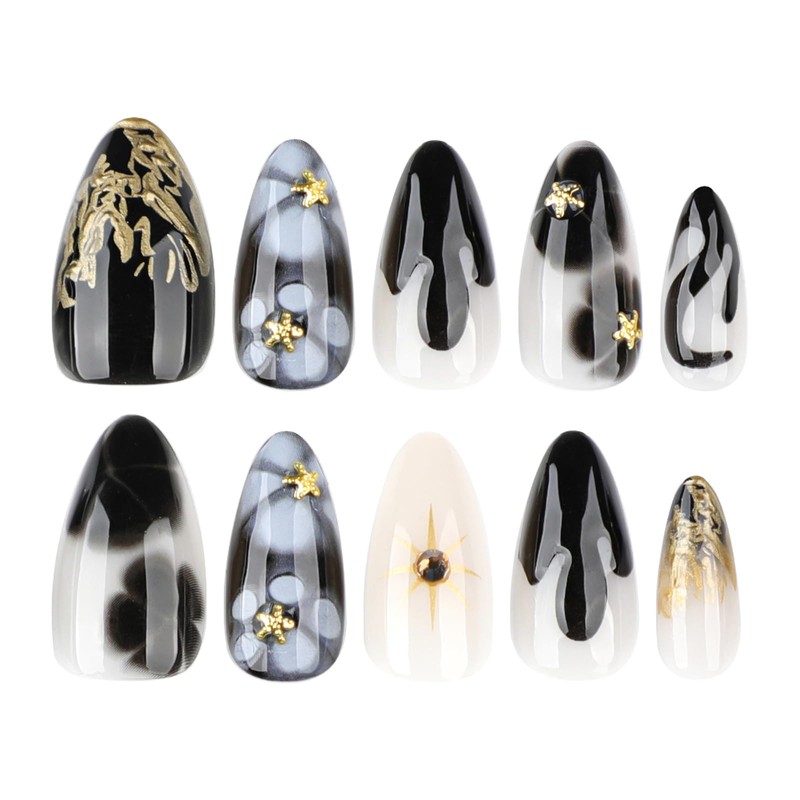 - 【Unique Design】 According to the most popular elements of the moment, these medium almond press on nails are designed with goth black flower and gold chrome.