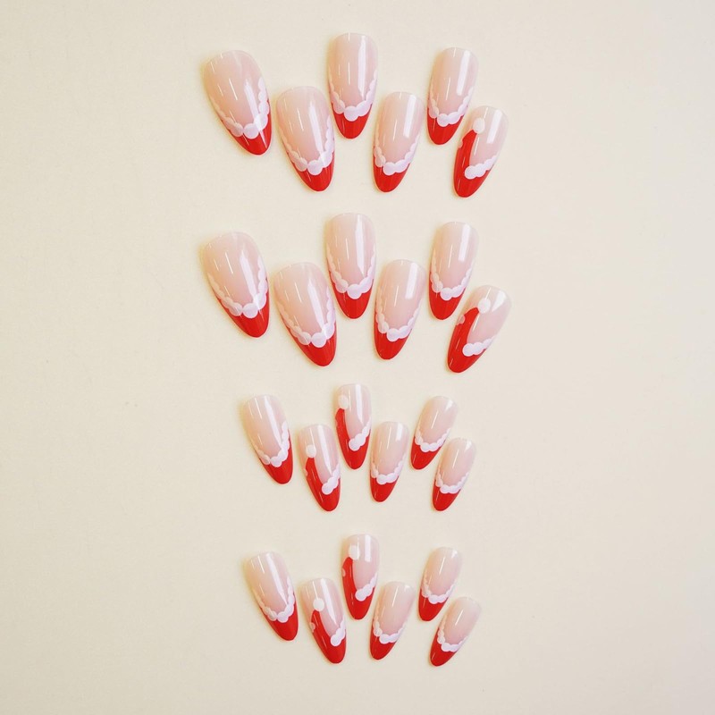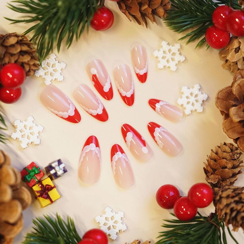 - 【Unique Design】 According to the most popular elements of the Christmas moment, these medium almond press on nails are designed with Santa hat french tip.
