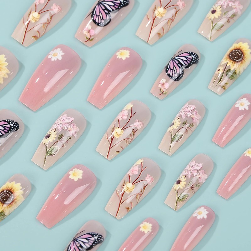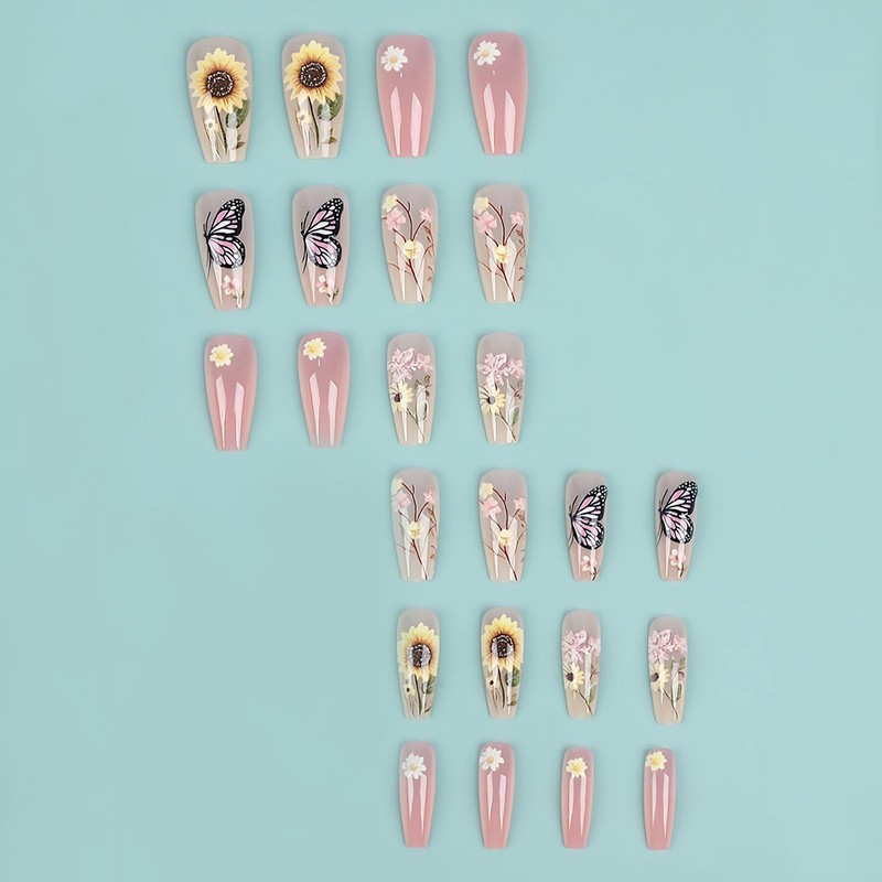 - 【Unique Design】 According to the most popular elements of the spring moment, these long coffin press on nails are designed with pink butterfly and sunflower.
